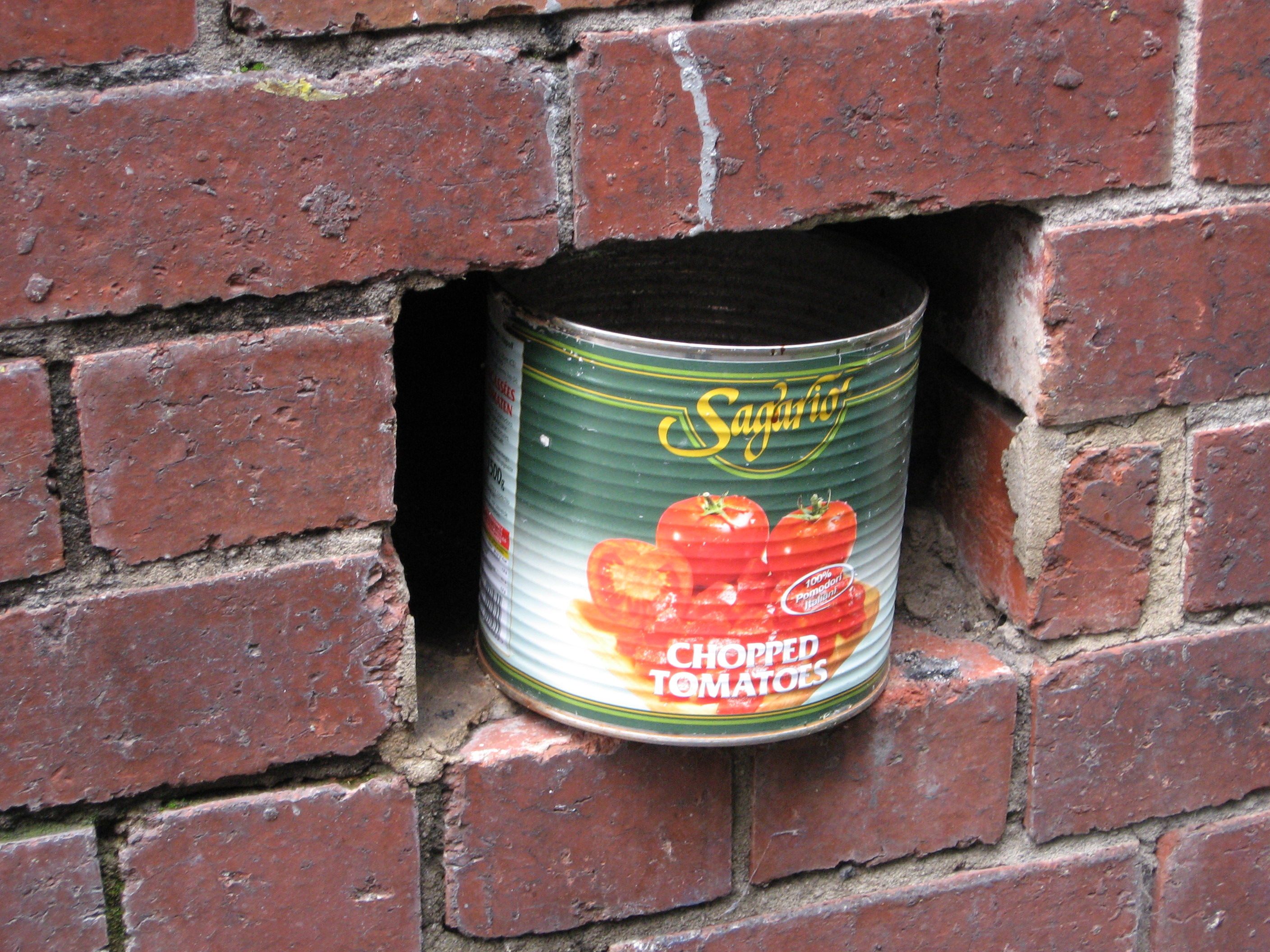 tomato tin in the wall, chopped tomatoes, street art, Is It Art?, Maryann Adair,